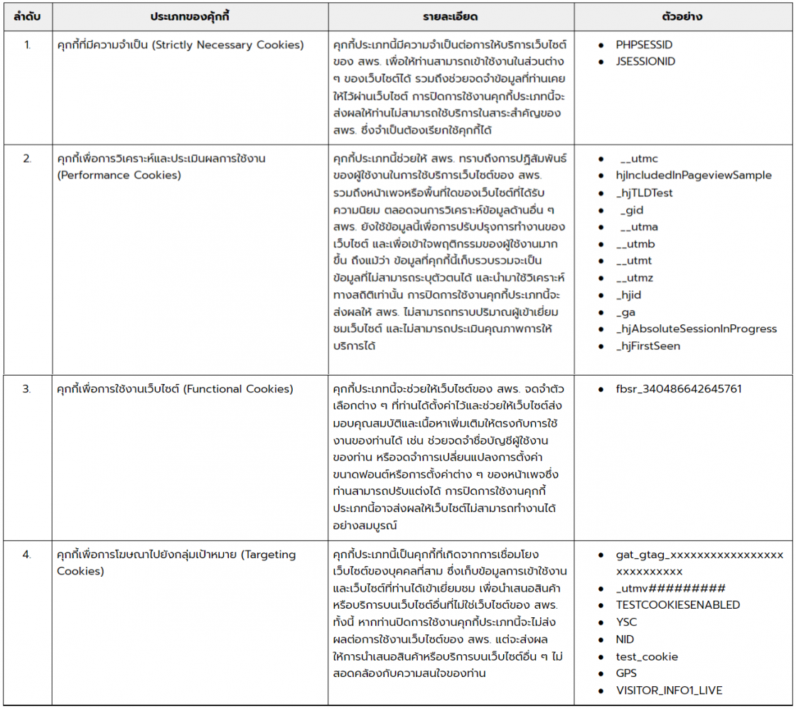 คุกกี้ คือ ไฟล์เล็ก ๆ เพื่อจัดเก็บข้อมูลการเข้าใช้งานเว็บไซต์ เช่น วันเวลา ลิงค์ที่คลิก หน้าที่เข้าชม เงื่อนไขการตั้งค่าต่าง ๆ โดยจะบันทึกลงไปในอุปกรณ์คอมพิวเตอร์ และ/หรือ เครื่องมือสื่อสารที่เข้าใช้งานของท่าน เช่น โน๊ตบุ๊ค แท็บเล็ต หรือ สมาร์ทโฟน ผ่านทางเว็บเบราว์เซอร์ในขณะที่ท่านเข้าสู่เว็บไซต์ โดยคุกกี้จะไม่ก่อให้เกิดอันตรายต่ออุปกรณ์คอมพิวเตอร์ และ/หรือ เครื่องมือสื่อสารของท่าน ในกรณีดังต่อไปนี้ ข้อมูลส่วนบุคคลของท่านอาจถูกจัดเก็บเพื่อใช้เพิ่มประสบการณ์การใช้งานบริการทางออนไลน์ โดยจะจำเอกลักษณ์ของภาษาและปรับแต่งข้อมูลการใช้งานตามความต้องการของท่าน เป็นการยืนยันคุณลักษณะเฉพาะตัว ข้อมูลความปลอดภัยของท่าน รวมถึงบริการที่ท่านสนใจ นอกจากนี้คุกกี้ยังถูกใช้เพื่อวัดปริมาณการเข้าใช้งานบริการทางออนไลน์ การปรับเปลี่ยนเนื้อหาตามการใช้งานของท่านโดยพิจารณาจากพฤติกรรมการเข้าใช้งานครั้งก่อน ๆ และ ณ ปัจจุบัน และอาจมีวัตถุประสงค์เพื่อการโฆษณาประชาสัมพันธ์